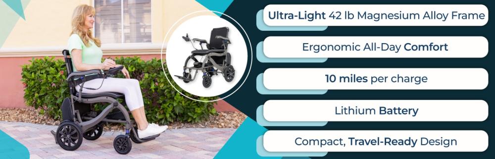 The Vive Air Frame Power Wheelchair, model MOB1125GRY, weighs only 42lbs and is TSA approved.